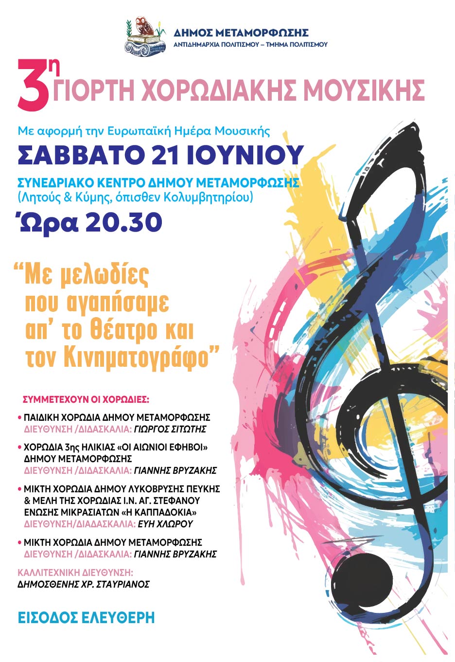 Η 3η Γιορτή Χορωδιακής Μουσικής έρχεται σε συνέχεια της επιτυχίας των προηγούμενων διοργανώσεων με τα Χορωδιακά Τμήματα του Δήμου Μεταμόρφωσης Αττικής να φιλοξενούν και φέτος διακεκριμένους ερμηνευτές, πιανίστες και μαέστρους.