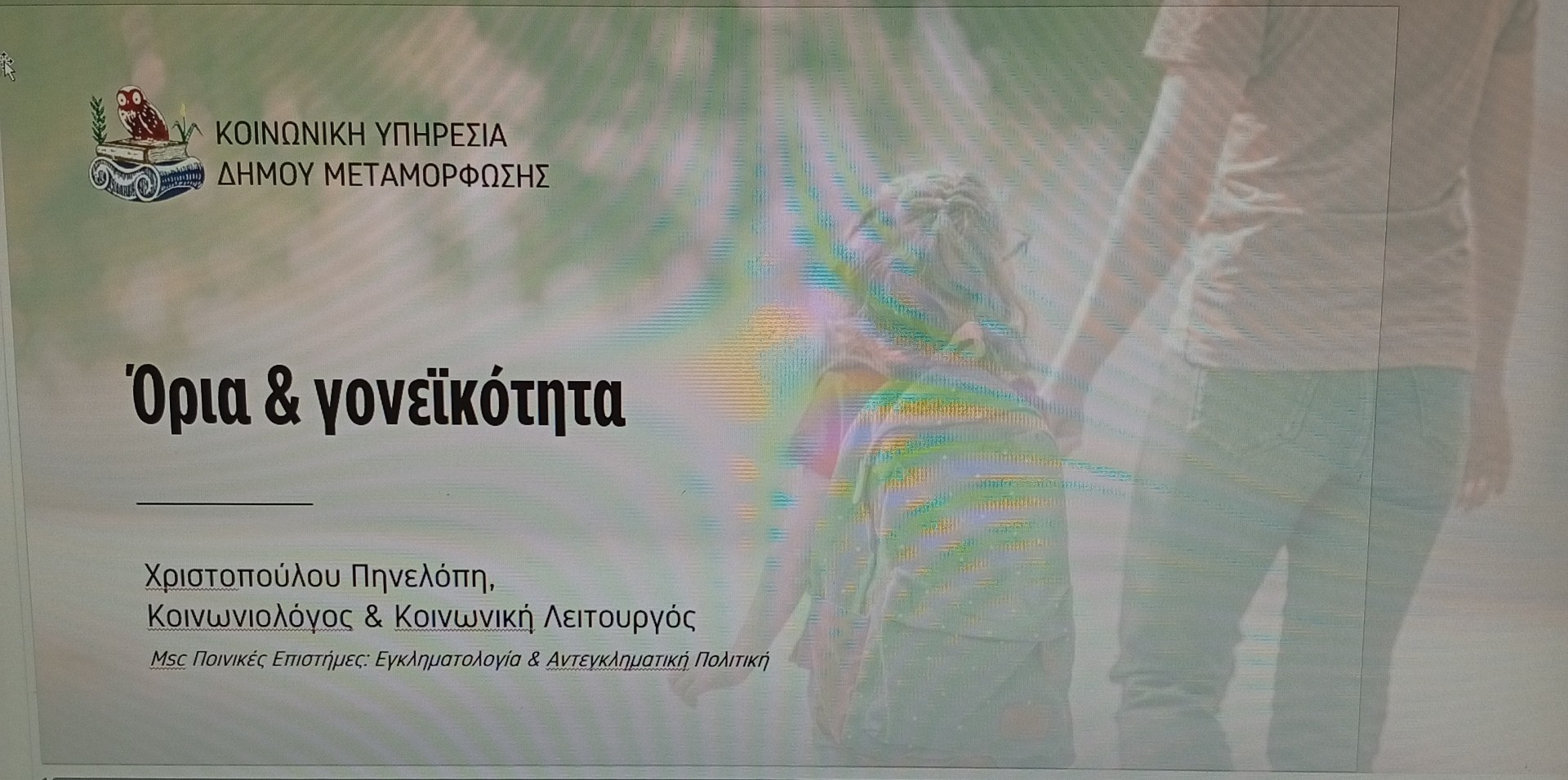 Η Κοινωνική Υπηρεσία του Δήμου Μεταμόρφωσης με πρωτοβουλία της Προϊσταμένης του 4ου Νηπιαγωγείου Μεταμόρφωσης, κυρίας Ελισάβετ Κωνσταντοπούλου, υλοποίησε διαδικτυακή ομιλία σε γονείς και εκπαιδευτικούς, στις 7 Απριλίου 2025.