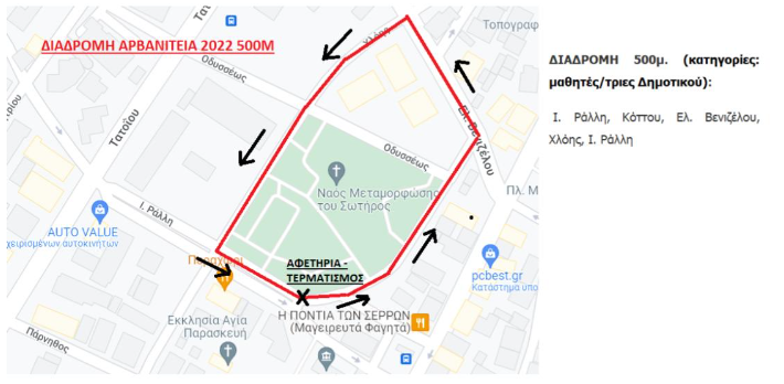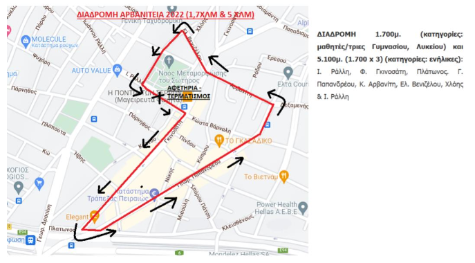 ΔΙΑΔΡΟΜΗ 1.700μ. και 5.100μ. (1.700 x 3): Ι. Ράλλη, Φ. Γκινοσάτη, Πλάτωνος. Γ. Παπανδρέου, Κ. Αρβανίτη, Ελ. Βενιζέλου, Χλόης & Ι. Ράλλη.