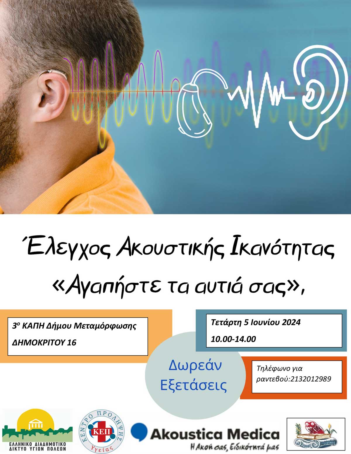 Το Τμήμα Προάσπισης & Προαγωγής Υγείας της Διεύθυνσης Κοινωνικής Πολιτικής & Προαγωγής Δημόσιας Υγείας του Δήμου Μεταμόρφωσης σε συνεργασία με το Ελληνικό Διαδημοτικό Δίκτυο Υγιών Πόλεων του Π.Ο.Υ. και την Εταιρεία AKOUSTIKA MEDICA, διοργανώνει δράση πρόληψης και πρώιμης διάγνωσης της ακουστικής ικανότητας με τίτλο «Αγαπήστε τα αυτιά σας».