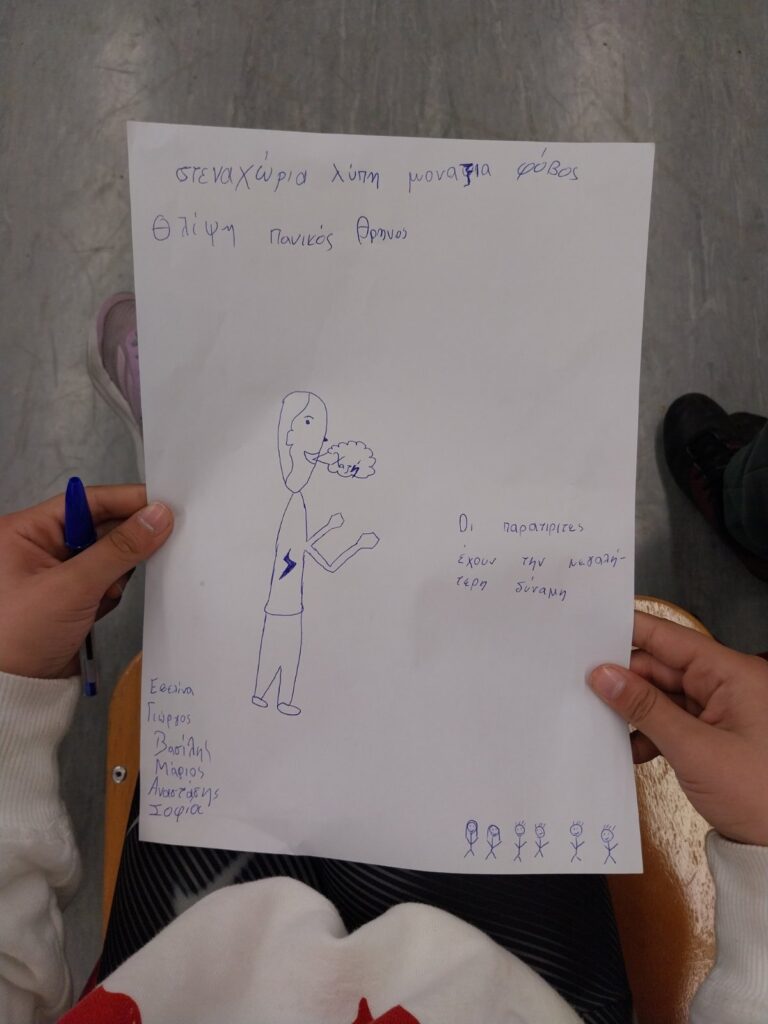 Κατά τη διάρκεια του εργαστηρίου, τα παιδιά εργάστηκαν ομαδικά. Ακολούθησε συζήτηση για τους ρόλους που αναπτύσσονται στο φαινόμενο του σχολικού εκφοβισμού, για τις συνέπειες της βίας, αλλά και για το ποια τάξη και ποια κοινωνία επιλέγουμε να δημιουργήσουμε: μια κοινωνία σιωπής ή μια κοινότητα αποδοχής, σεβασμού και αλληλεγγύης.