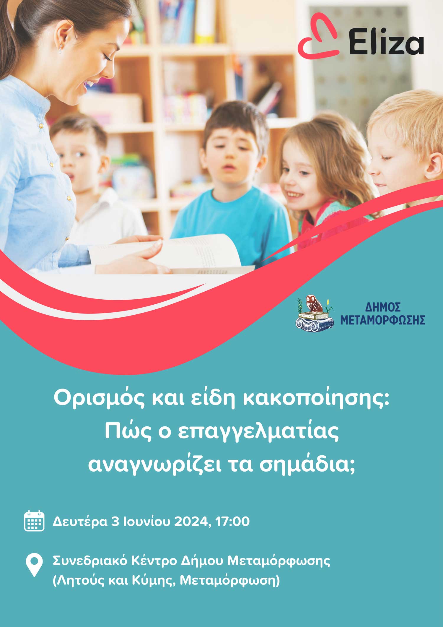 Ο Δήμος Μεταμόρφωσης και η Δ/νση Κοινωνικής Πολιτικής και Προαγωγής Δημ. Υγείας διοργανώνουν την Δευτέρα 3 Ιουνίου 2024 στις 17:00 στο Συνεδριακό Κέντρο του Δήμου (Λητούς και Κύμης), σε συνεργασία με τον οργανισμό ΕΛΙΖΑ, εκπαιδευτική εκδήλωση με τίτλο «Ορισμός και είδη κακοποίησης. Πως ο επαγγελματίας αναγνωρίζει τα σημάδια;».