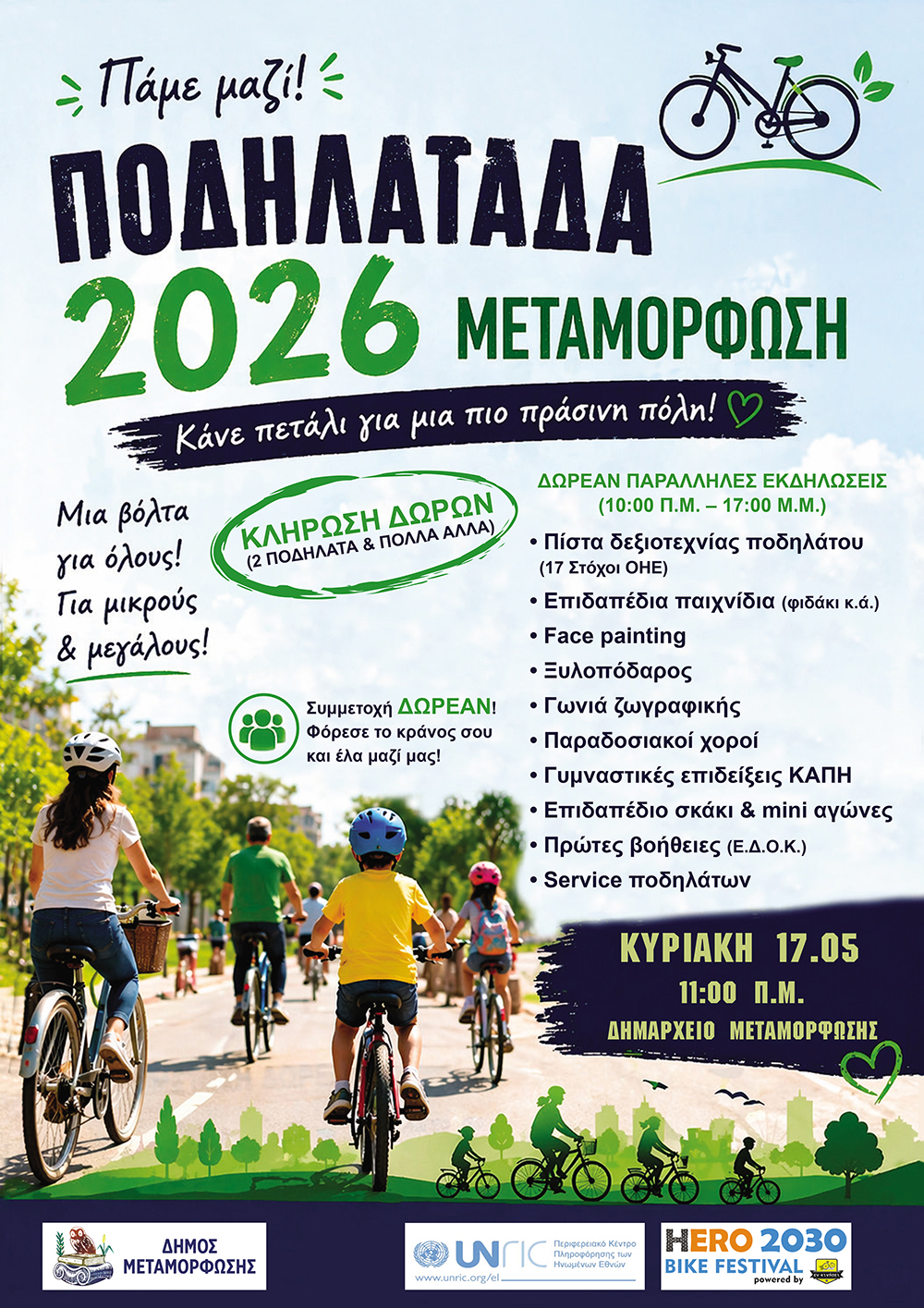 Ο Δήμος Μεταμόρφωσης και το Τμήμα Αθλητισμού σας προσκαλεί να συμμετάσχετε στον πιο συναρπαστικό γύρο της πόλης μας με ποδήλατο την Κυριακή 17.05.2026 και ώρα 10:00 με 17:00 κι αφετηρία το Δημαρχείο της πόλης.