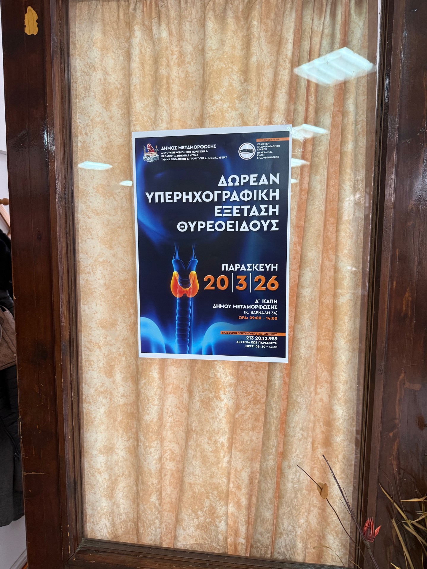 Με πολύ μεγάλη επιτυχία και προσέλευση κόσμου ολοκληρώθηκε η δράση δωρεάν υπερηχογραφικής εξέτασης θυρεοειδούς που διοργάνωσε το Τμήμα Προάσπισης και Προαγωγής της Δημόσιας Υγείαςτου Δήμου Μεταμόρφωσης σε συνεργασία με την Ελληνική Ενδοκρινολογική Εταιρεία και την Πανελλήνια Ένωση Ενδοκρινολόγων.