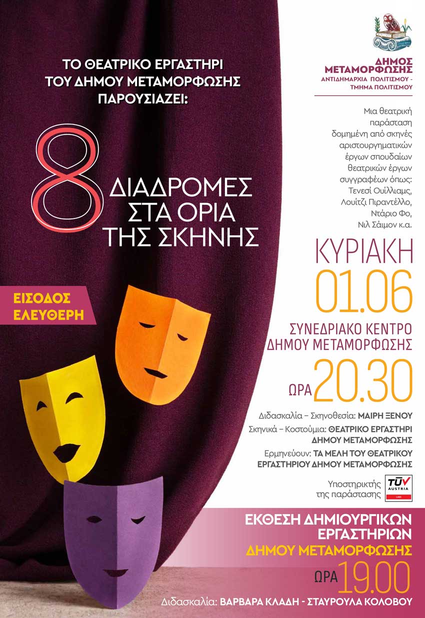 Το Τμήμα Πολιτισμού του Δήμου Μεταμόρφωσης σας προσκαλεί Κυριακή 1/6 και ώρα 20:30 στο Συνεδριακό Κέντρο για την παράσταση που ετοίμασε με πολύ αγάπη, μελέτη, κόπο και μεράκι το Θεατρικό Εργαστήρι του Δήμου μας ''8 Διαδρομές στα Όρια της Σκηνής'', καθώς και την Έκθεση των μελών των Δημιουργικών Εργαστηρίων μας, που θα πραγματοποιηθεί την ίδια ημέρα και ώρα 19:00 στο φουαγιέ του χώρου.