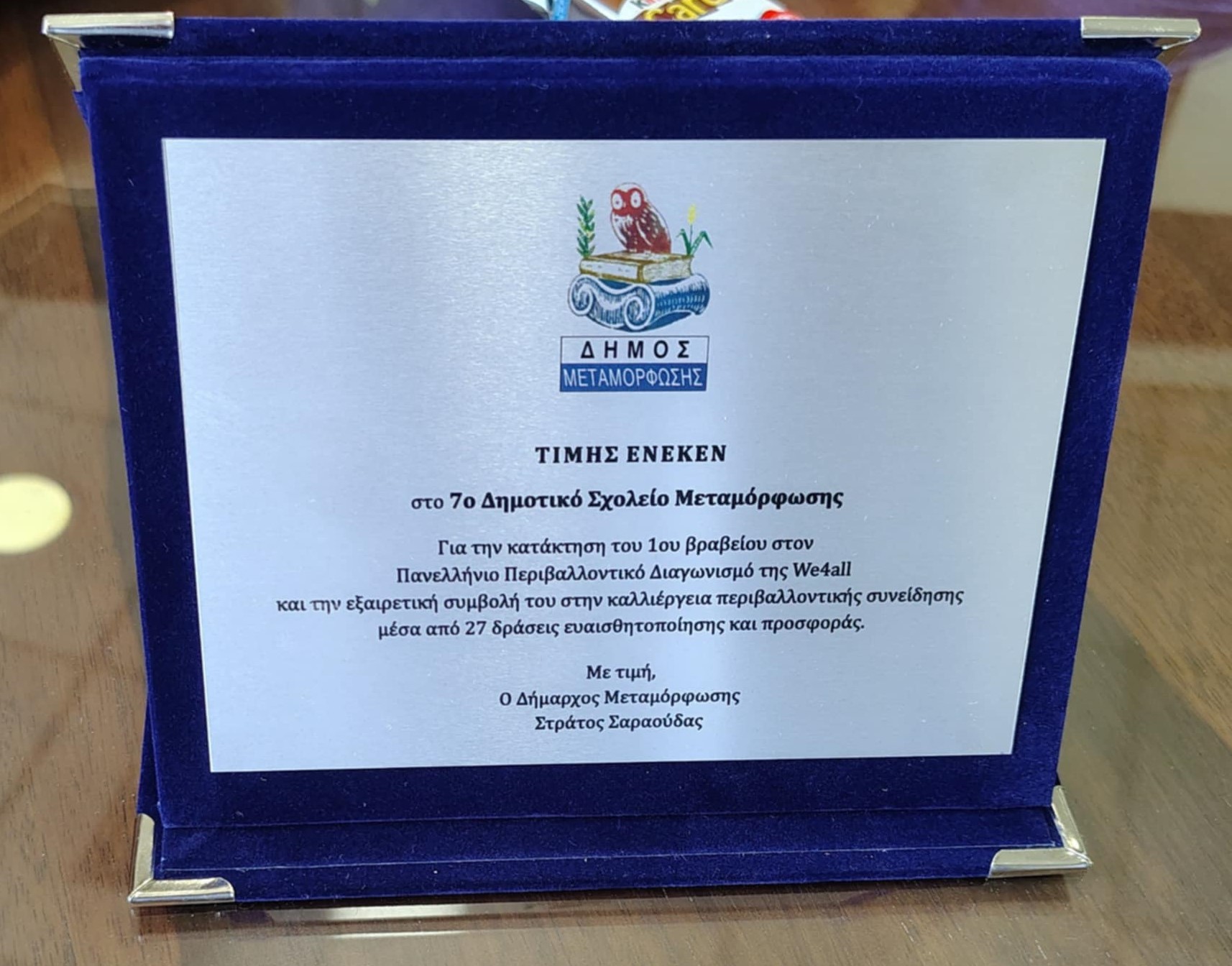 Μια συνάντηση κατά την οποία τους απέδωσε τιμητική πλακέτα για την πρώτη θέση στον Περιβαντολλογικό Διαγωνισμό της We4all μέσα από 27 δράσεις ευαισθητοποίησης και προσφοράς.