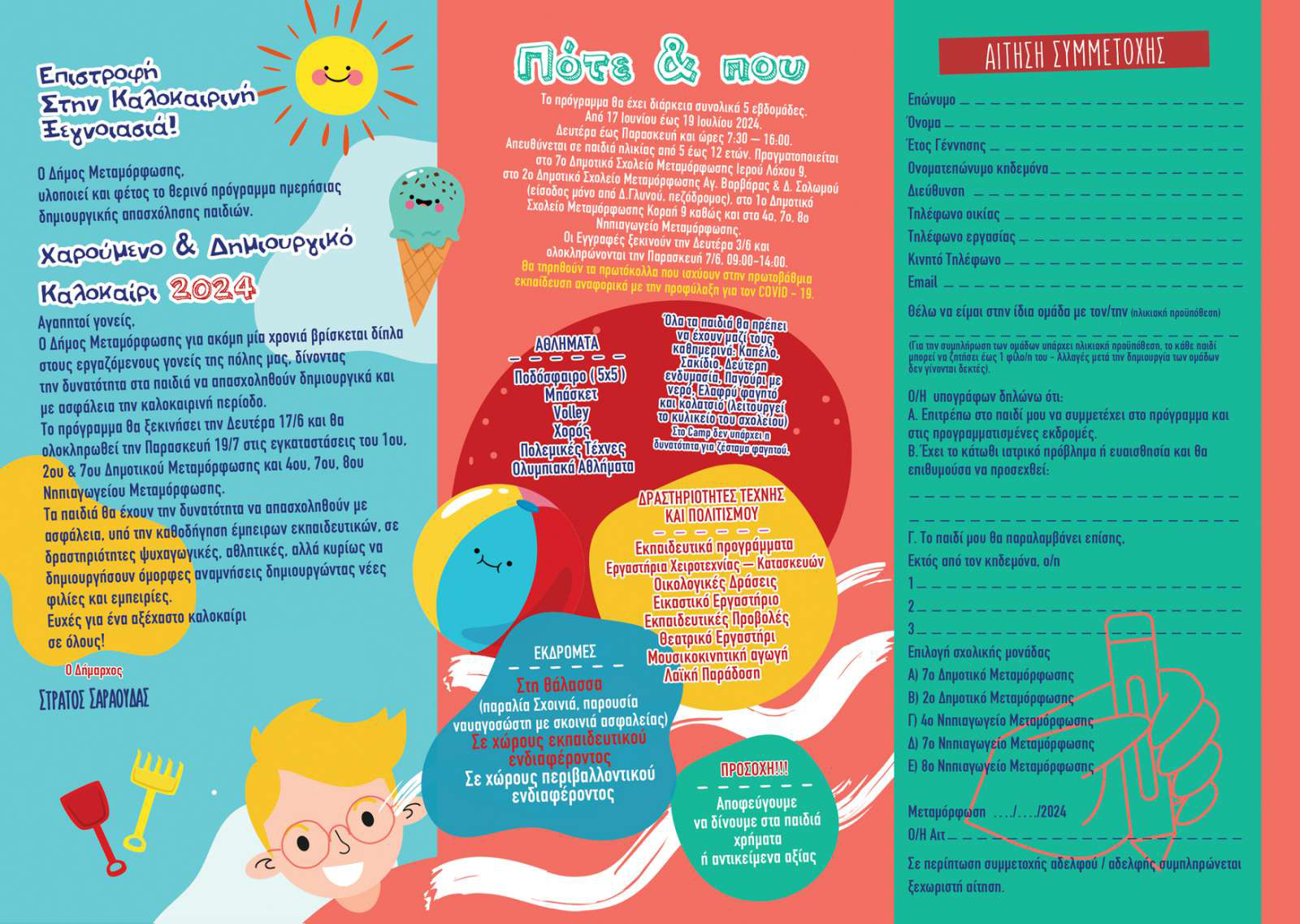 Ο Δήμος Μεταμόρφωσης υλοποιεί και φέτος το θερινό πρόγραμμα ημερήσιας δημιουργικής απασχόλησης παιδιών με τίτλο "Χαρούμενο και Δημιουργικό Καλοκαίρι 2024". Ο Δήμος για μία ακόμη χρονιά βρίσκεται δίπλα στους εργαζόμενους γονείς της πόλης, δίνοντας τη δυνατότητα στα παιδιά ν' απασχοληθούν δημιουργικά και με ασφάλεια την καλοκαιρινή περίοδο. Το πρόγραμμα διαρκεί συνολικά πέντε (5) εβδομάδες. Θα ξεκινήσει τη Δευτέρα 17/6 και θα ολοκληρωθεί την Παρασκευή 19/7, στις εγκαταστάσεις του 1ου, του 2ου και του 7ου Δημοτικού Σχολείου Μεταμόρφωσης, καθώς και του 4ου, 7ου και 8ου Νηπιαγωγείου Μεταμόρφωσης.