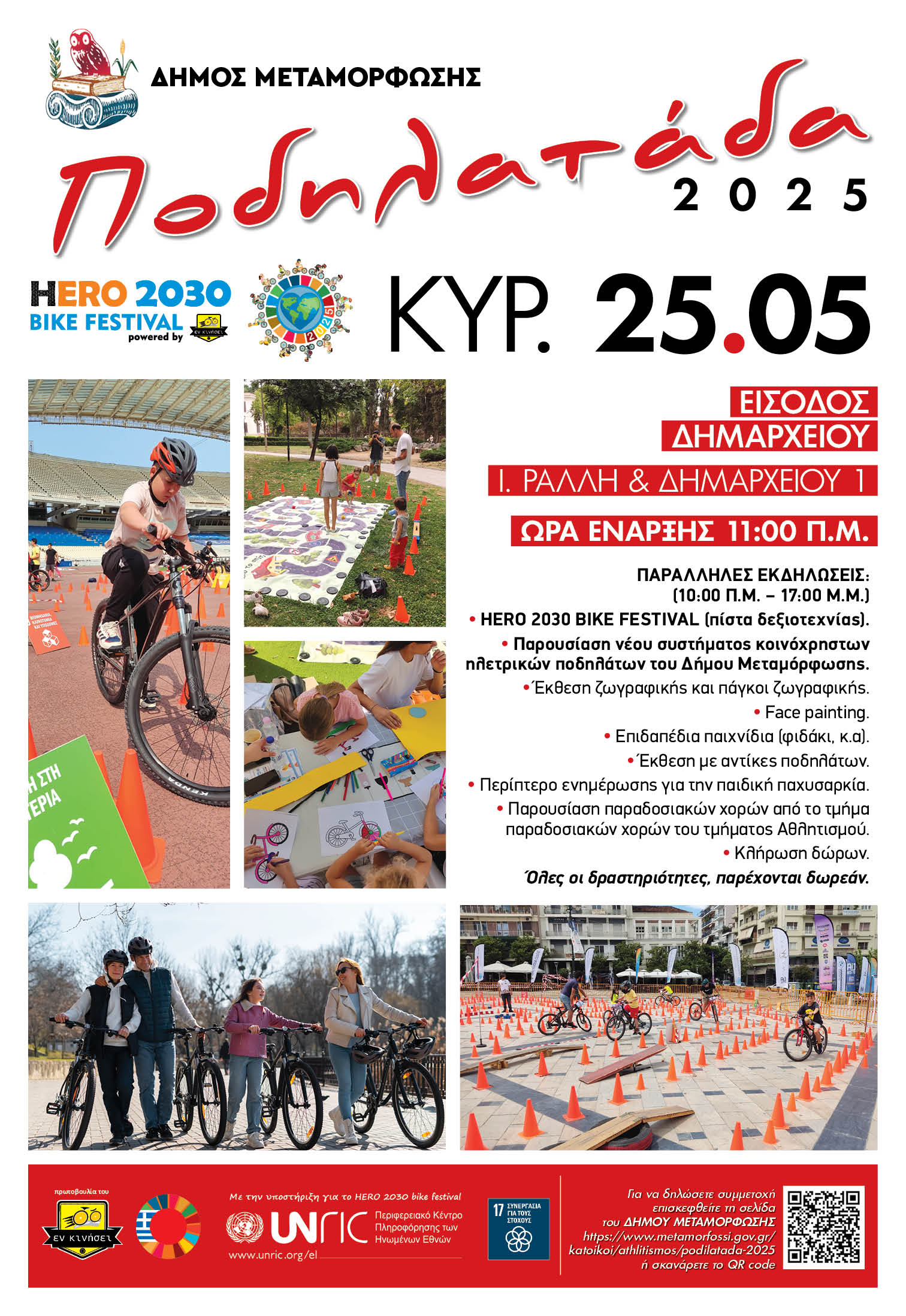 Ο Δήμος Μεταμόρφωσης και το Τμήμα Αθλητισμού σας προσκαλούν να συμμετάσχετε στον πιο συναρπαστικό γύρο της πόλης μας με ποδήλατο την Κυριακή 25.05.2025 και ώρα 11:00 με αφετηρία το Δημαρχείο της πόλης.