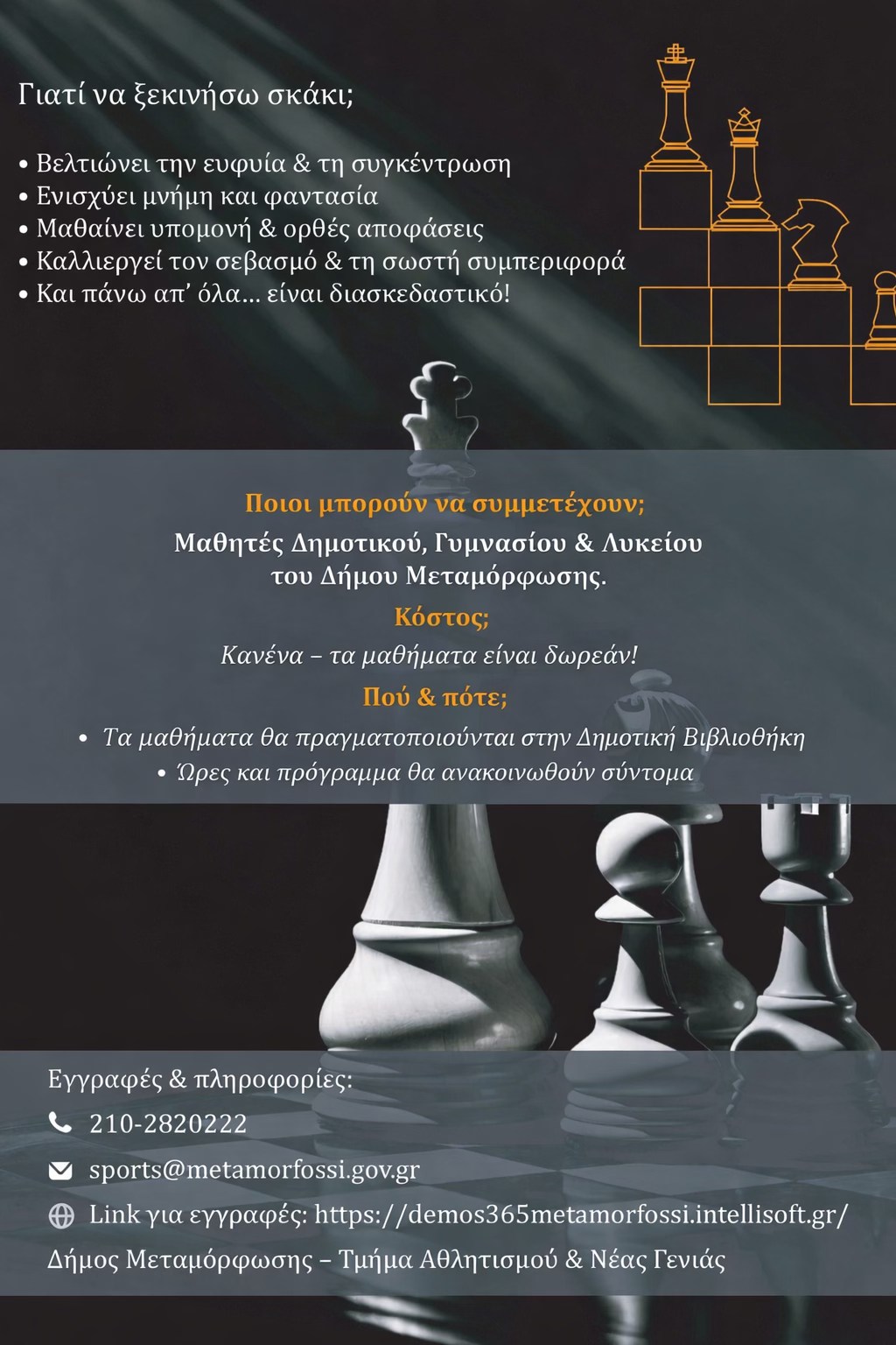 ΞΕΚΙΝΟΥΝ ΔΩΡΕΑΝ ΜΑΘΗΜΑΤΑ ΣΚΑΚΙ ΣΤΟΝ ΔΗΜΟ ΜΕΤΑΜΟΡΦΩΣΗΣ!