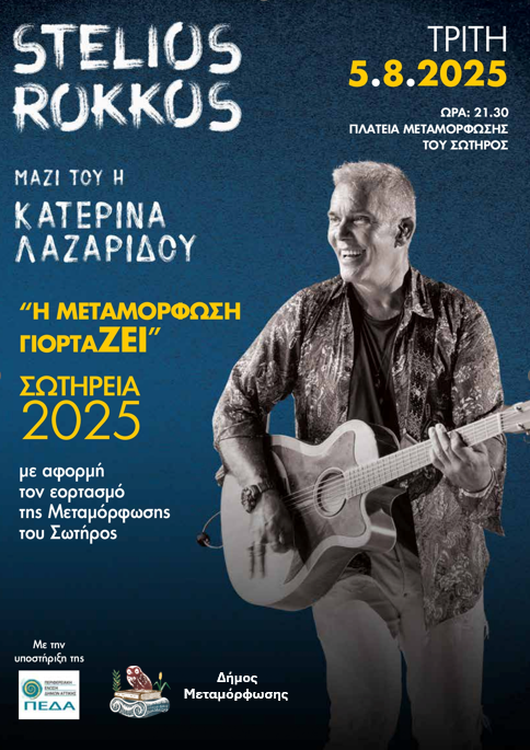Στις 5 Αυγούστου και ώρα 21.30 στην πλατεία Μεταμόρφωσης του Σωτήρος, ο μοναδικός Στέλιος Ρόκκος έρχεται να ξεσηκώσει την πόλη με τις μεγάλες επιτυχίες του!