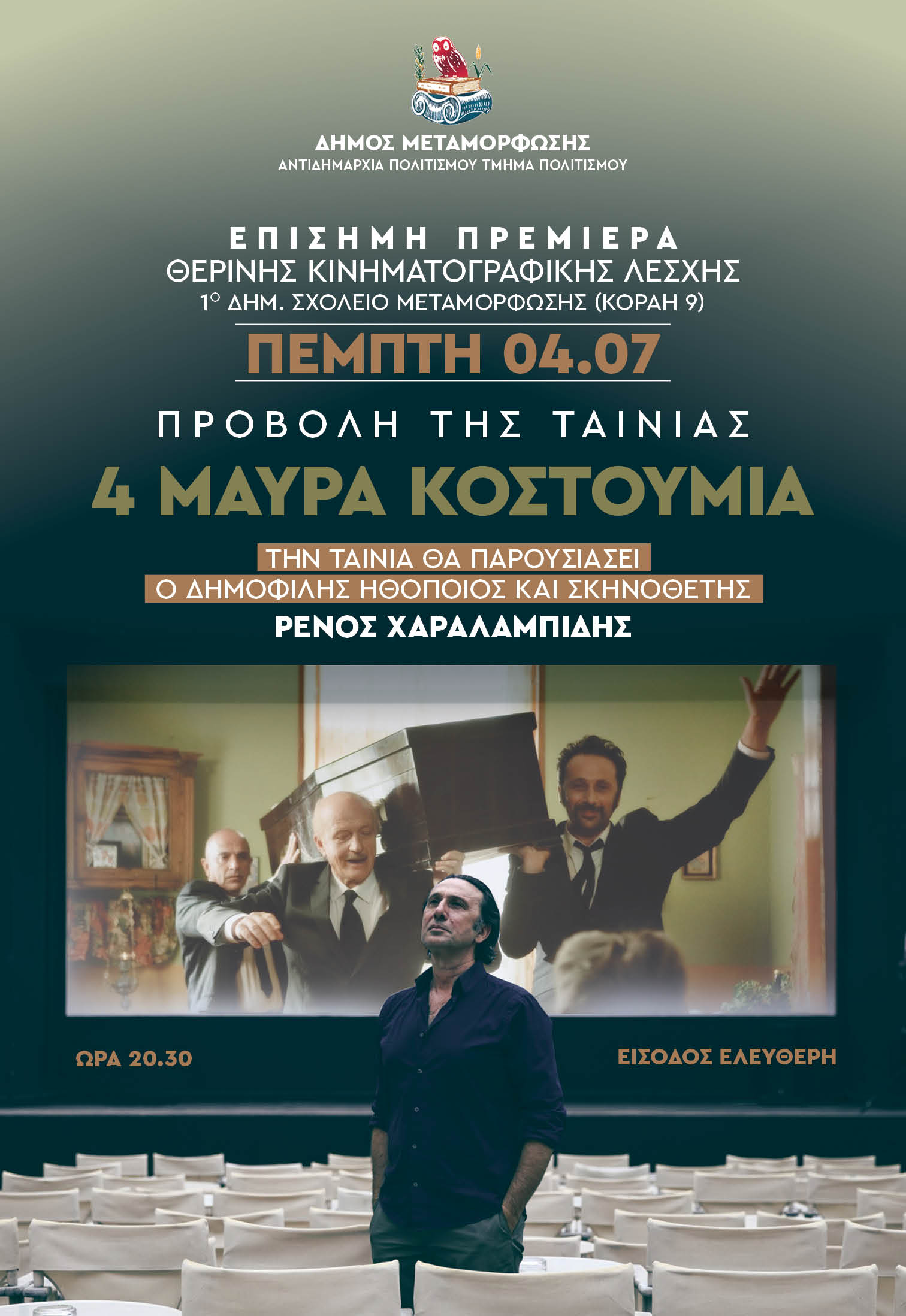 Η προβολή της ταινίας ''4 Μαύρα Κοστούμια'' και η παρουσίαση της από τον δημοφιλή ηθοποιό και σκηνοθέτη Ρένο Χαραλαμπίδη θα επαναπρογραμματιστεί σε νέα ημερομηνία.