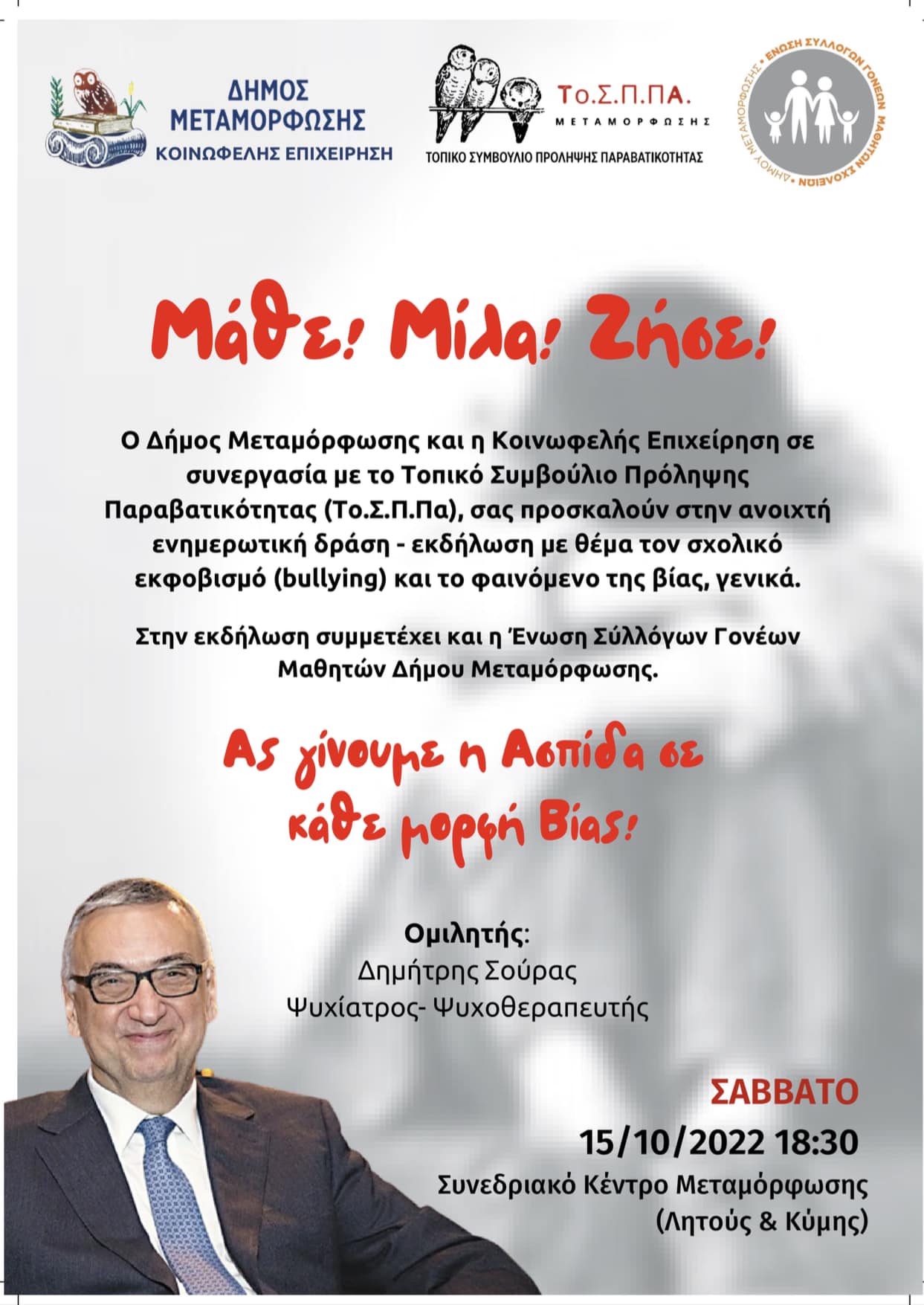 Ο Δήμος Μεταμόρφωσης Αττικής, το Τοπικό Συμβούλιο Προληψης Παραβατικότητας του Δήμου Μεταμόρφωσης και η Κοινωφελής Επιχείρηση Δήμου Μεταμόρφωσης σας προσκαλούν στην ανοιχτή ενημερωτική εκδήλωση με θέμα την Βία σε κάθε της μορφή (bullying, ενδο-έξω σχολική βία, ενδοοικογενειακή βία κλπ), δράση στην οποία συμμετέχει και η Ένωση Συλλόγων Γονέων Μαθητών Σχολείων Δ. Μεταμόρφωσης.