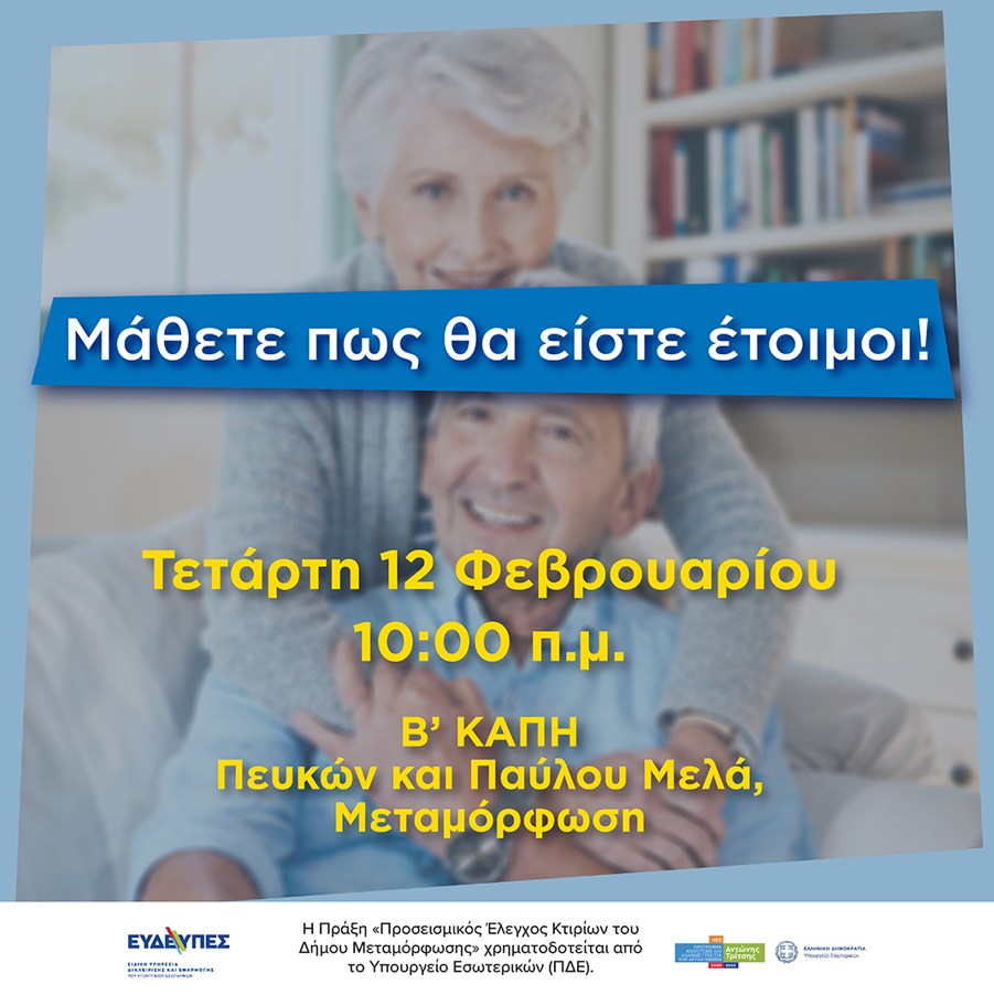 Την Τετάρτη 12 Φεβρουαρίου, στις 10 το πρωί, στο Β’ ΚΑΠΗ (Πευκών και Παύλου Μελά) του Δήμου Μεταμόρφωσης, θα πραγματοποιηθεί ενημερωτική δράση για τη σωστή αντίδραση σε ενδεχόμενο σεισμικής δράσης με τίτλο "Προετοιμάζομαι για τον σεισμό, Προστατεύομαι από τον σεισμό".