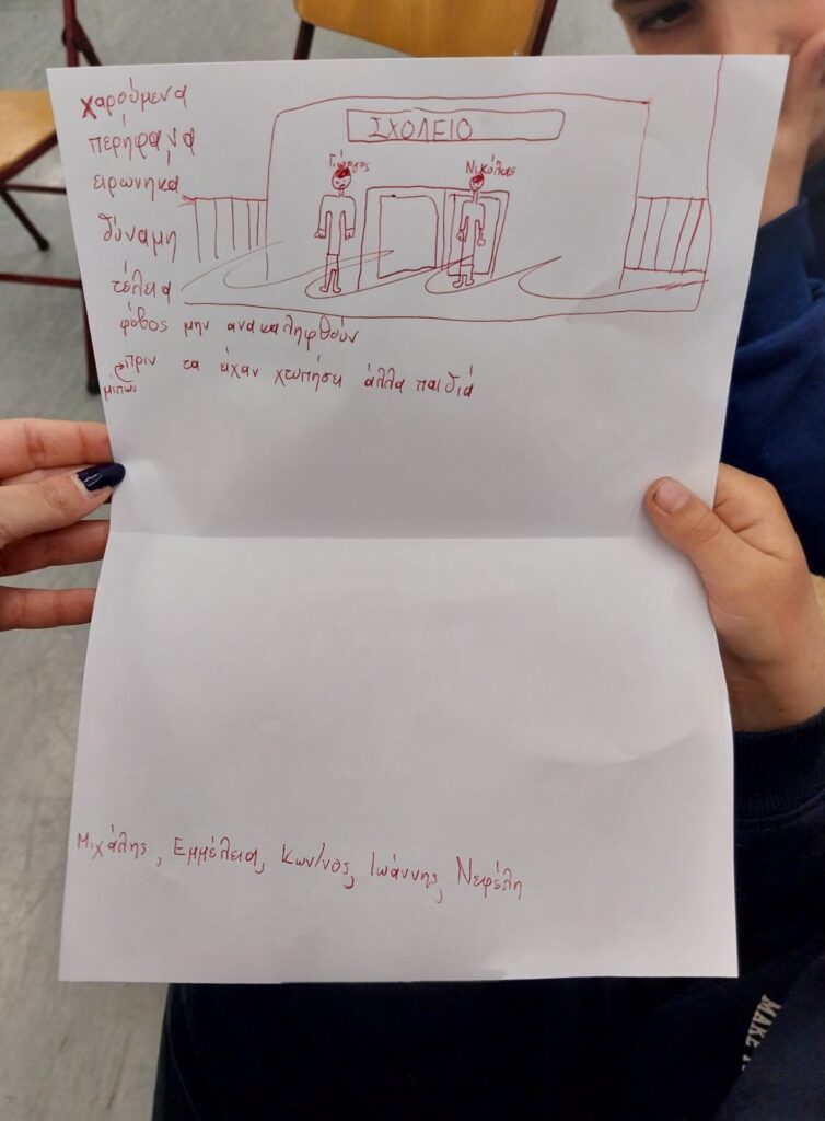 Κατά τη διάρκεια του εργαστηρίου, τα παιδιά εργάστηκαν ομαδικά. Ακολούθησε συζήτηση για τους ρόλους που αναπτύσσονται στο φαινόμενο του σχολικού εκφοβισμού, για τις συνέπειες της βίας, αλλά και για το ποια τάξη και ποια κοινωνία επιλέγουμε να δημιουργήσουμε: μια κοινωνία σιωπής ή μια κοινότητα αποδοχής, σεβασμού και αλληλεγγύης.