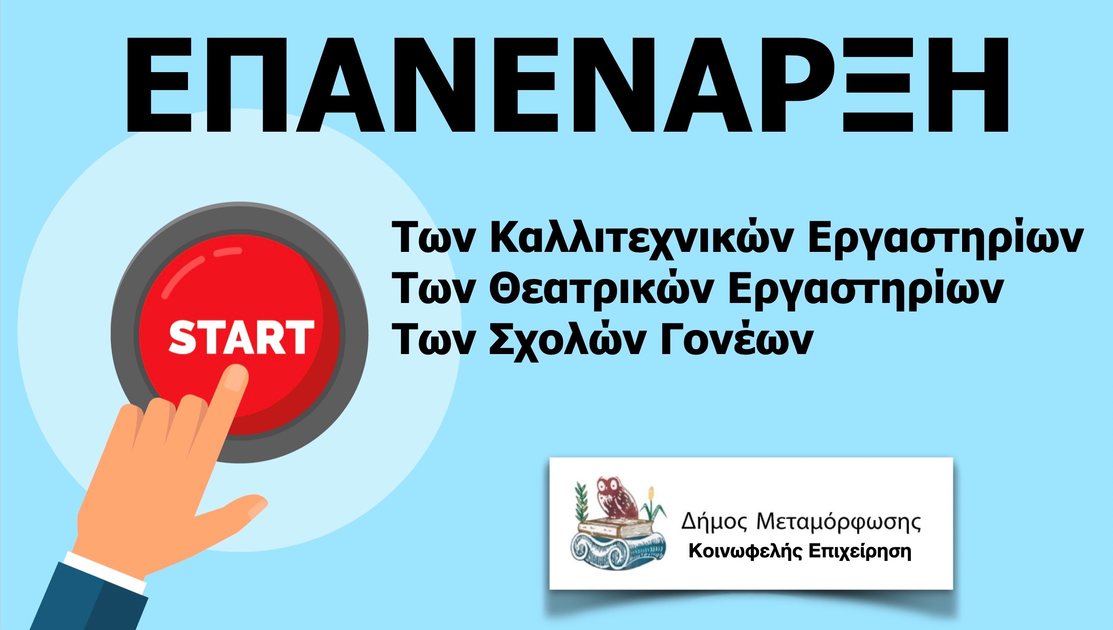 Επαναλειτουργούν από την επόμενη εβδομάδα - δια ζώσης πλέον - τα Καλλιτεχνικά & Θεατρικά Εργαστήρια για παιδιά καθώς και οι Σχολές Γονέων για ενήλικες, που σχεδίασε, οργάνωσε και υλοποιεί, από τον Απρίλιο, η Κοινωφελής Επιχείρηση του Δήμου Μεταμόρφωσης για το 2021.
