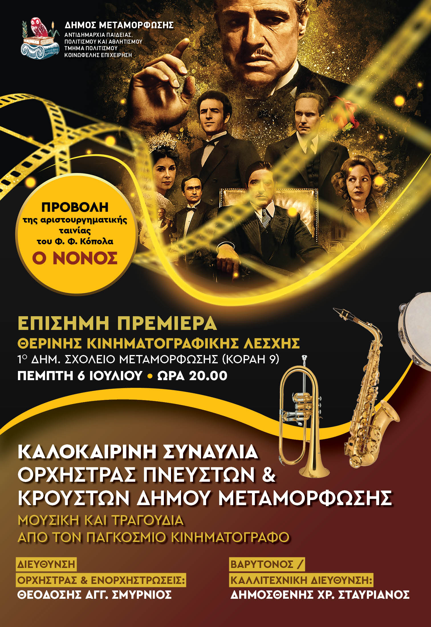 Η βραδιά θα ξεκινήσει με την Μεγάλη Συναυλία της Ορχήστρας Πνευστών & Κρουστών του Δήμου Μεταμόρφωσης, υπό τη διεύθυνση του αρχιμουσικού Θεοδόσιου Άγγελου Σμυρνιού, με μουσική και τραγούδια του σπουδαίου Nino Rota που περιλαμβάνονται στο soundtrack της ταινίας, αλλά και ξεχωριστές, διαχρονικές, μεγάλες επιτυχίες απ’ τον Παγκόσμιο Κινηματογράφο, που έχουν αγαπηθεί ιδιαίτερα απ’ το ευρύ κοινό. Την καλλιτεχνική διεύθυνση της βραδιάς, όπως και συνολικά του προγράμματος έχει ο βαρύτονος Δημοσθένης Χρ. Σταυριανός.