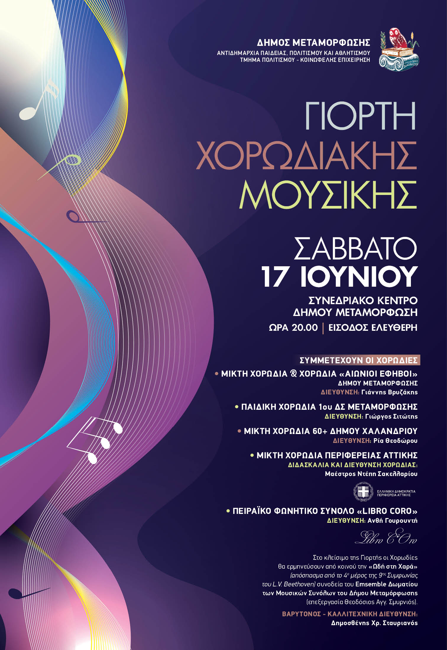 Με χαρά σας προσκαλούμε στη Γιορτή Χορωδιακής Μουσικής με εκλεκτά Χορωδιακά Σύνολα & πολλές εκπλήξεις, στις 17/6/2023 και ώρα 20:00 στο Συνεδριακό Κέντρο του Δήμου Μεταμόρφωσης (Κύμης & Λητούς).