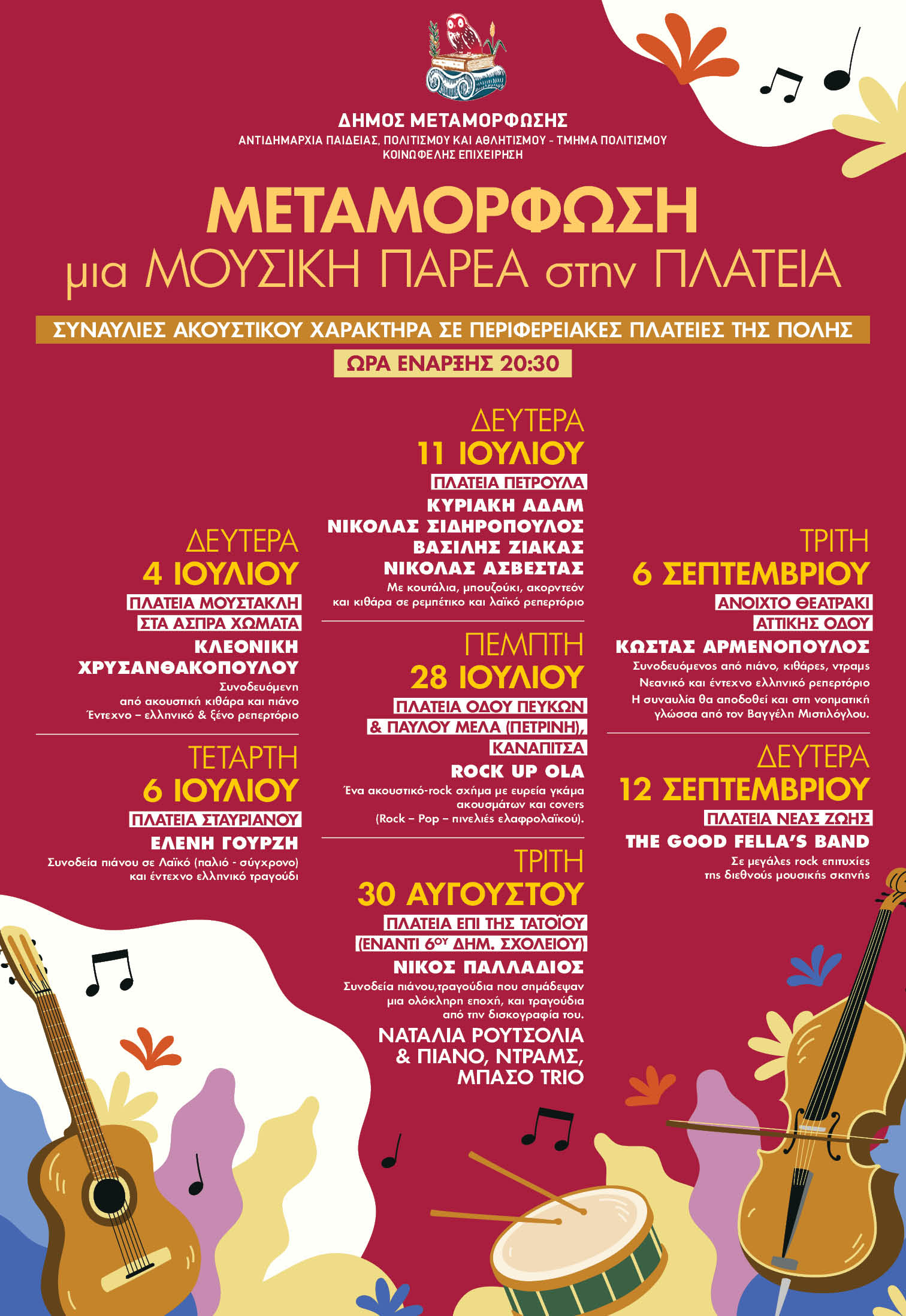 Σας προσκαλούμε στην 6η κατά σειρά συναυλία της ιδιαίτερης δράσης μας, με τις ''Ακουστικού Χαρακτήρα Συναυλίες στις Περιφερειακές Πλατείες'' της πόλης μας, για να θυμηθούμε ξανά τις εποχές που η συνάντηση γινόταν παρέα, η κουβεντούλα τραγούδι και το τραγούδι συγκίνηση.