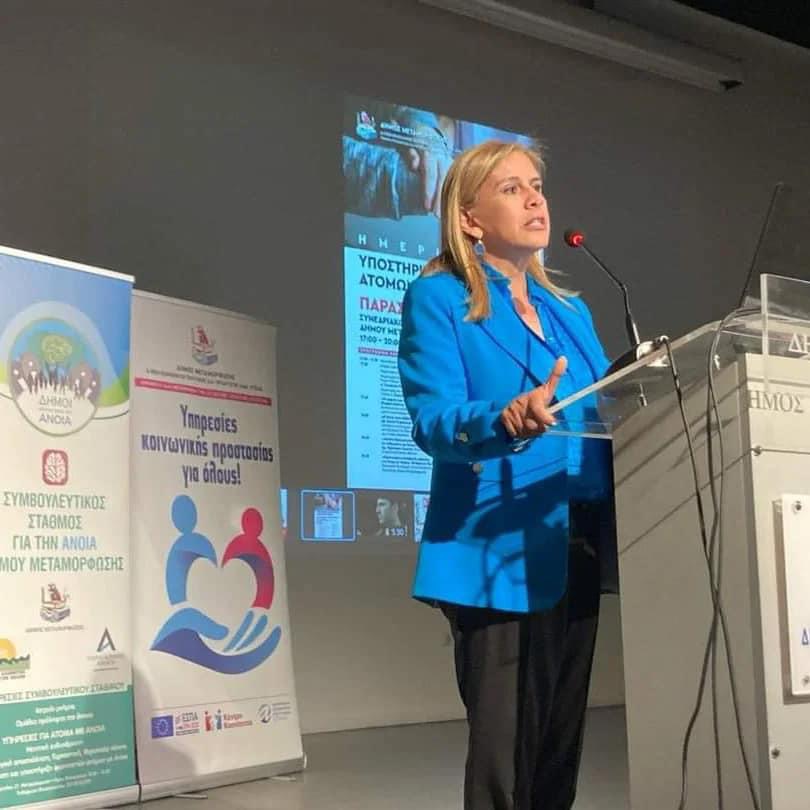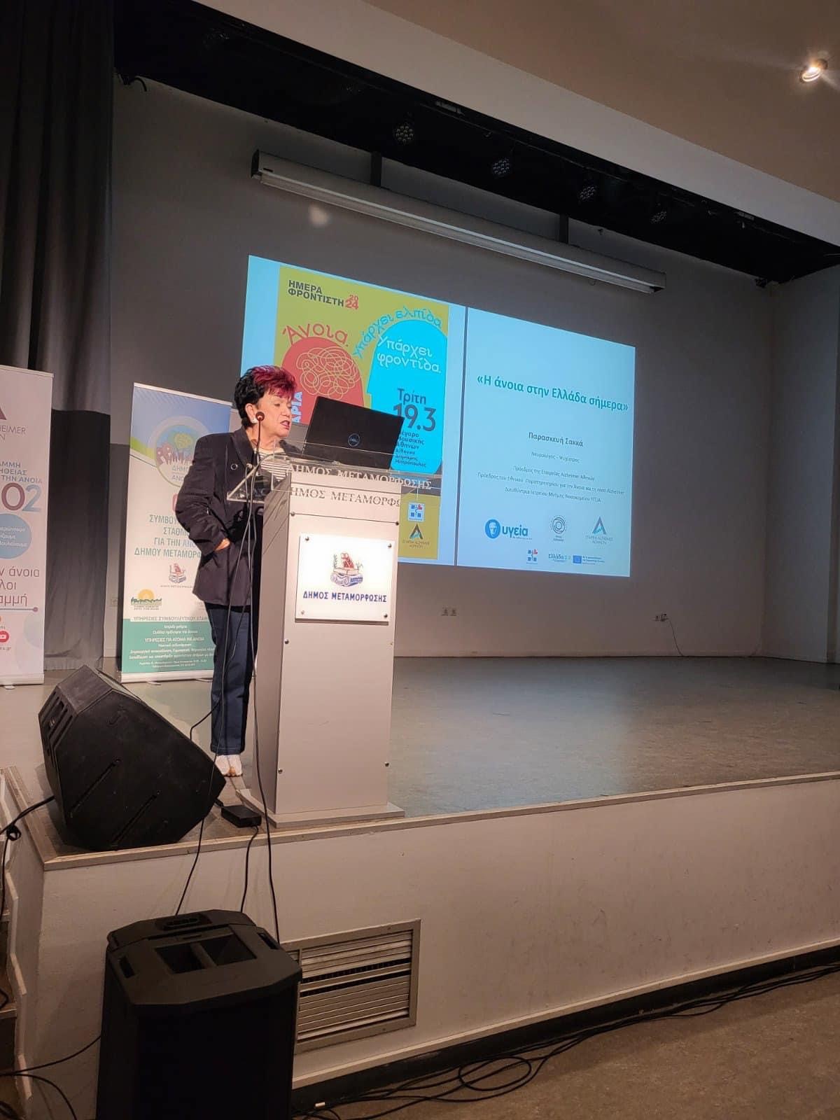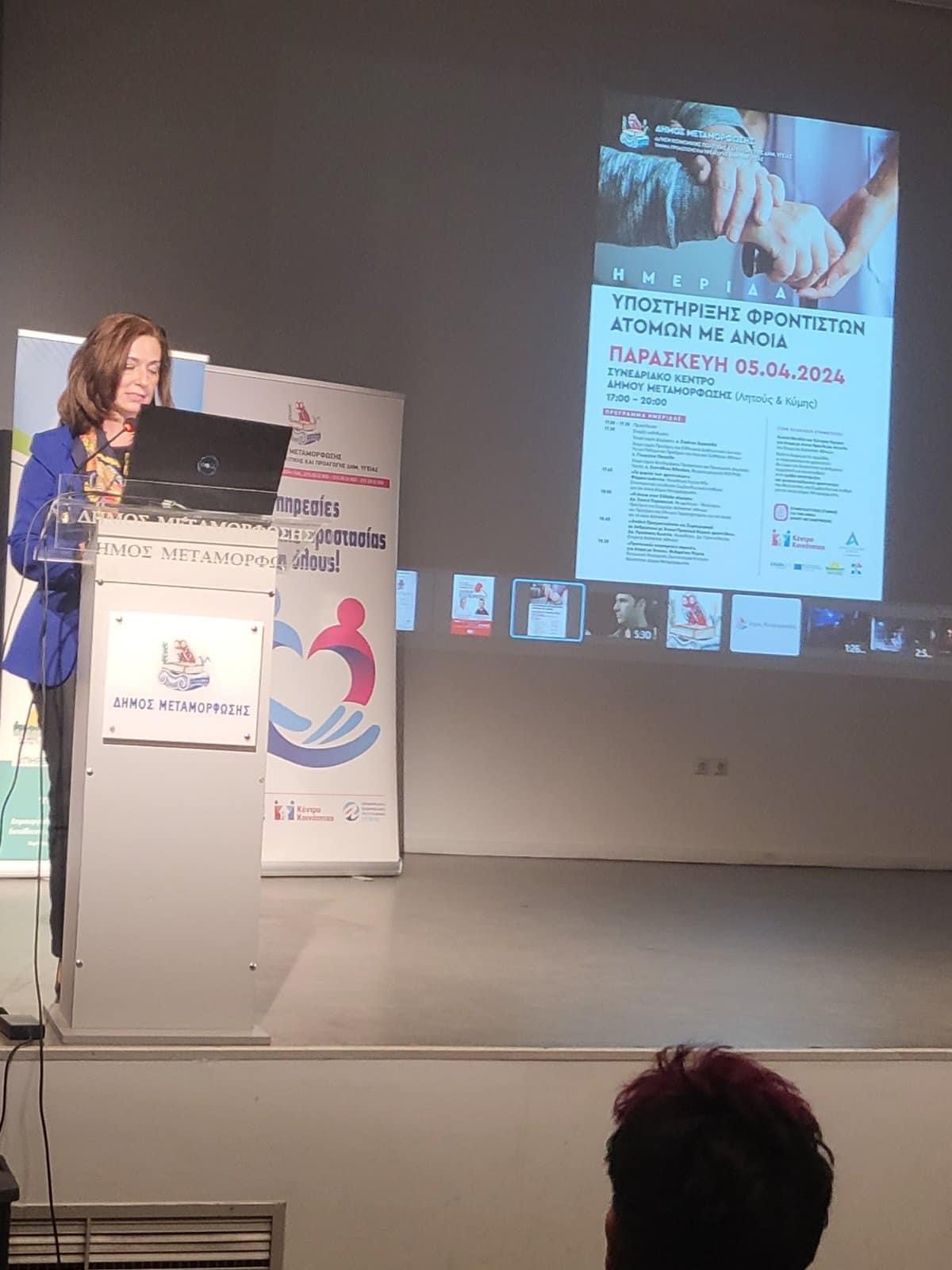 Η ημερίδα ολοκληρώθηκε με την ενημέρωση των παρευρισκομένων συμπολιτών μας για τις «Προνοιακές αναπηρικές παροχές, για άτομα με Άνοια», από την Συντονίστρια του Κέντρου Κοινότητας Δήμου Μεταμόρφωσης, κα Φιλαρέτου Πέρσα.