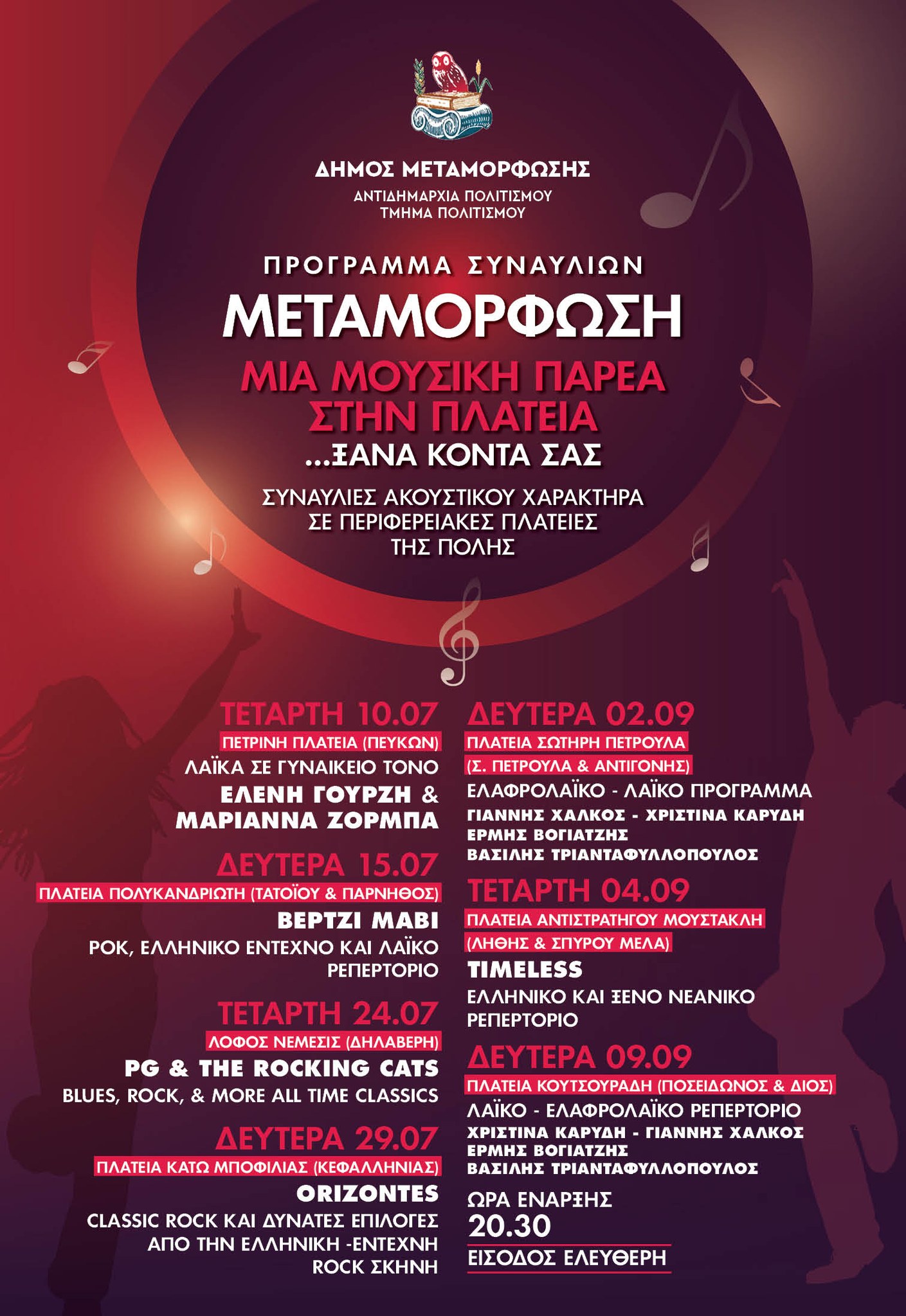 Πρεμιέρα αύριο Τετάρτη 10/7 και ώρα 20:30, για το αγαπημένο πρόγραμμα ''Μεταμόρφωση - μια Μουσική Παρέα στην Πλατεία'' στην Πέτρινη Πλατεία επί της Πεύκων με ''Λαϊκά σε τόνο Γυναικείο''.
