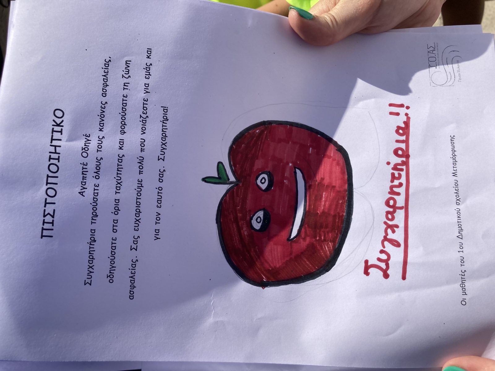 Συγκεκριμένα αξιωματικοί της Τροχαίας και σήμερα βρέθηκαν σε κεντρικό δρόμο της πόλης μας και άρχισαν σταματούν οχήματα. Στη συνέχεια μαθητές του 1ου Δημοτικού Σχολείου Μεταμόρφωσης, έχοντας μάθει κάποιες βασικές αρχές οδικής ασφάλειας από τον ΙΟΑΣ, θέτουν στους οδηγούς μια σειρά ερωτημάτων. Μέσα από τις απαντήσεις οι μαθητές αποφασίζουν αν είναι καλοί ή κακοί οδηγοί και τους δίνουν αντίστοιχα ένα μήλο ή ένα λεμόνι.