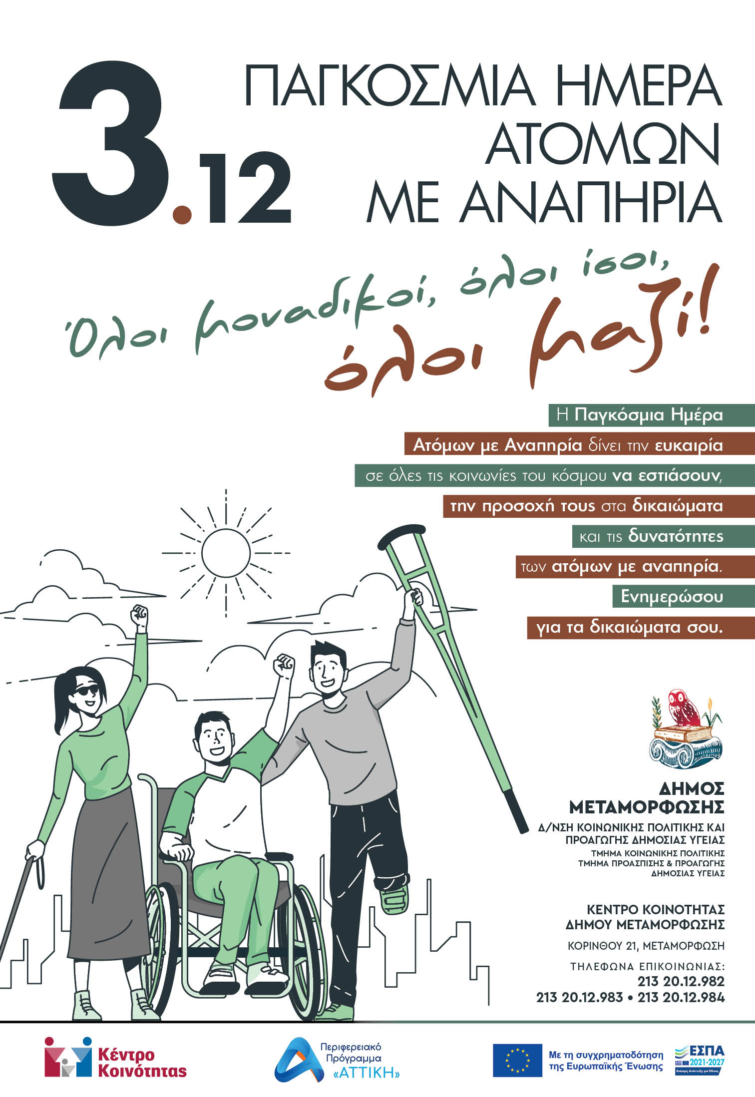 Αυτή η μέρα, πέρα από τον συμβολισμό, είναι μια έκκληση για δράση: να συνεχίσουμε να αναγνωρίζουμε τις ανάγκες των ατόμων με αναπηρία, να εξαλείψουμε τις διακρίσεις και τα εμπόδια που τους περιορίζουν και να ενδυναμώσουμε τους πολίτες, ανεξαρτήτως αναπηρίας, να διεκδικούν την ισότιμη θέση τους στην κοινωνία.