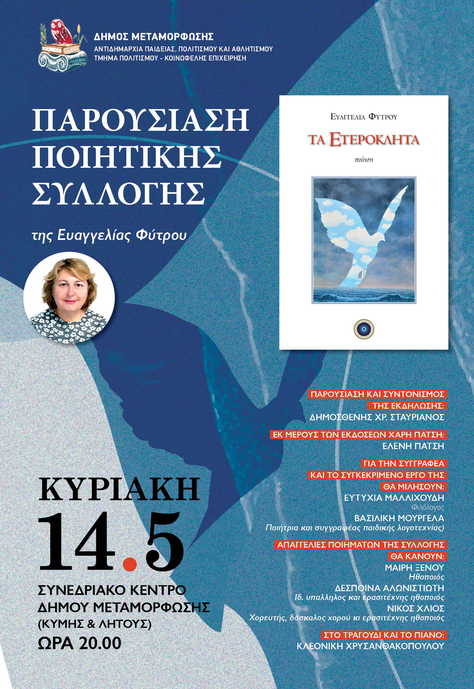 Με χαρά σας προσκαλούμε στην πρώτη παρουσίαση της ποιητικής συλλογής "Τα Ετερόκλητα", της εξαιρετικά αγαπητής στην πόλη, τέως διευθύντριας του 1ου Γ.Ε.Λ Μεταμόρφωσης, φιλόλογου κας Ευαγγελίας Φύτρου, την ερχόμενη Κυριακή 14/5/23 και ώρα 20:00 στο Συνεδριακό Κέντρο (Κύμης & Λητούς). Η αγαπητή συντοπίτισσα αποτυπώνει σε βιβλίο για πρώτη φορά ποιήματα της και σε αυτήν την πρώτη εκδοτική της απόπειρα, το Τμήμα Πολιτισμού βρίσκεται κοντά της. Ένα εξαιρετικό πάνελ ομιλητών θα μιλήσει για την συλλογή, ενώ καλλιτέχνες της πόλης θα απαγγείλουν επιλεγμένα αποσπάσματα απ’ το βιβλίο και θα πλαισιώσουν με σχετικής θεματολογίας τραγούδια τη βραδιά.