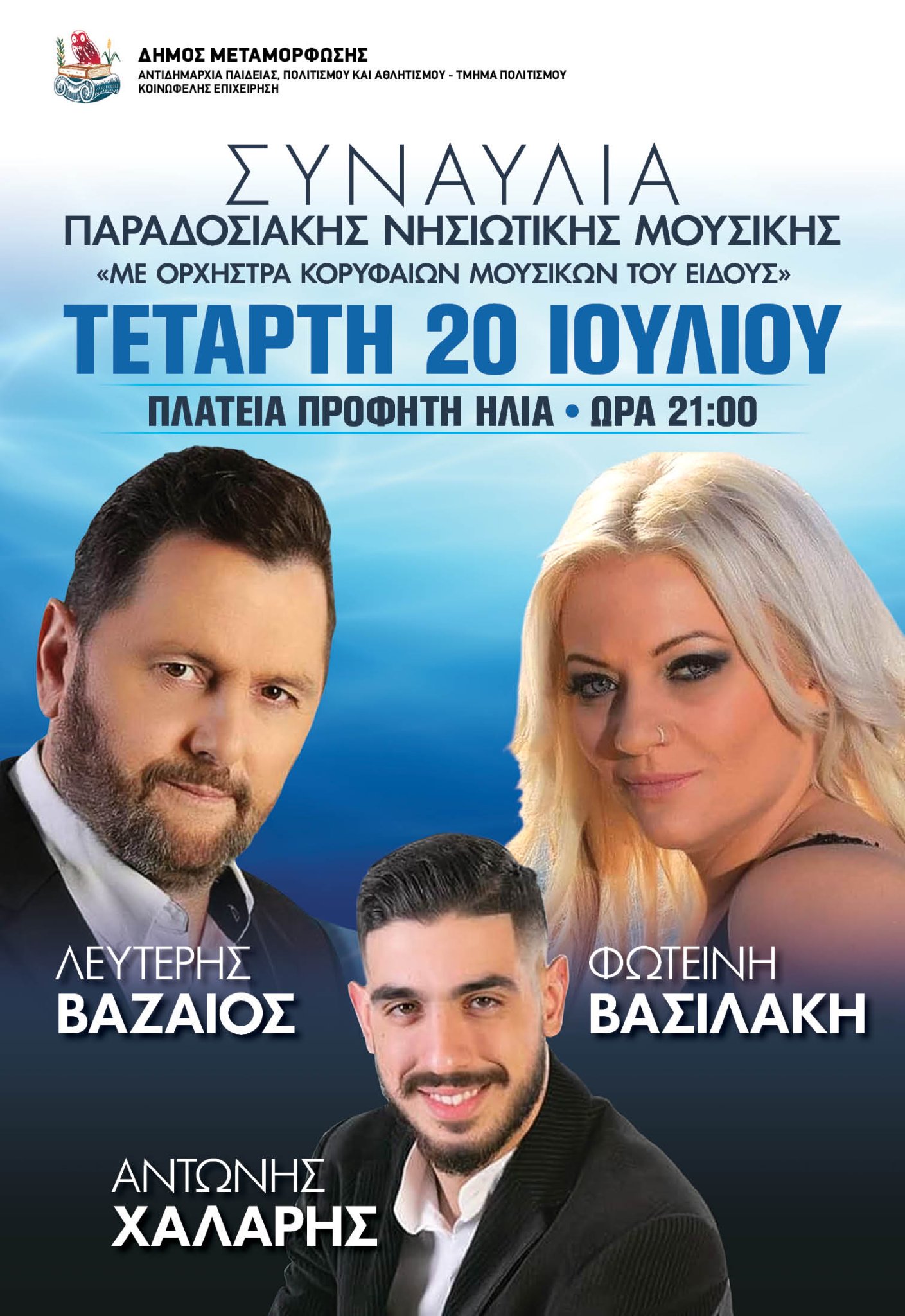 Τετάρτη 20/7 παραδοσιακή - νησιώτικη συναυλία με τους Λευτέρη Βαζαίο, Φωτεινή Βασιλάκη και μια ορχήστρα κορυφαίων μουσικών του είδους!