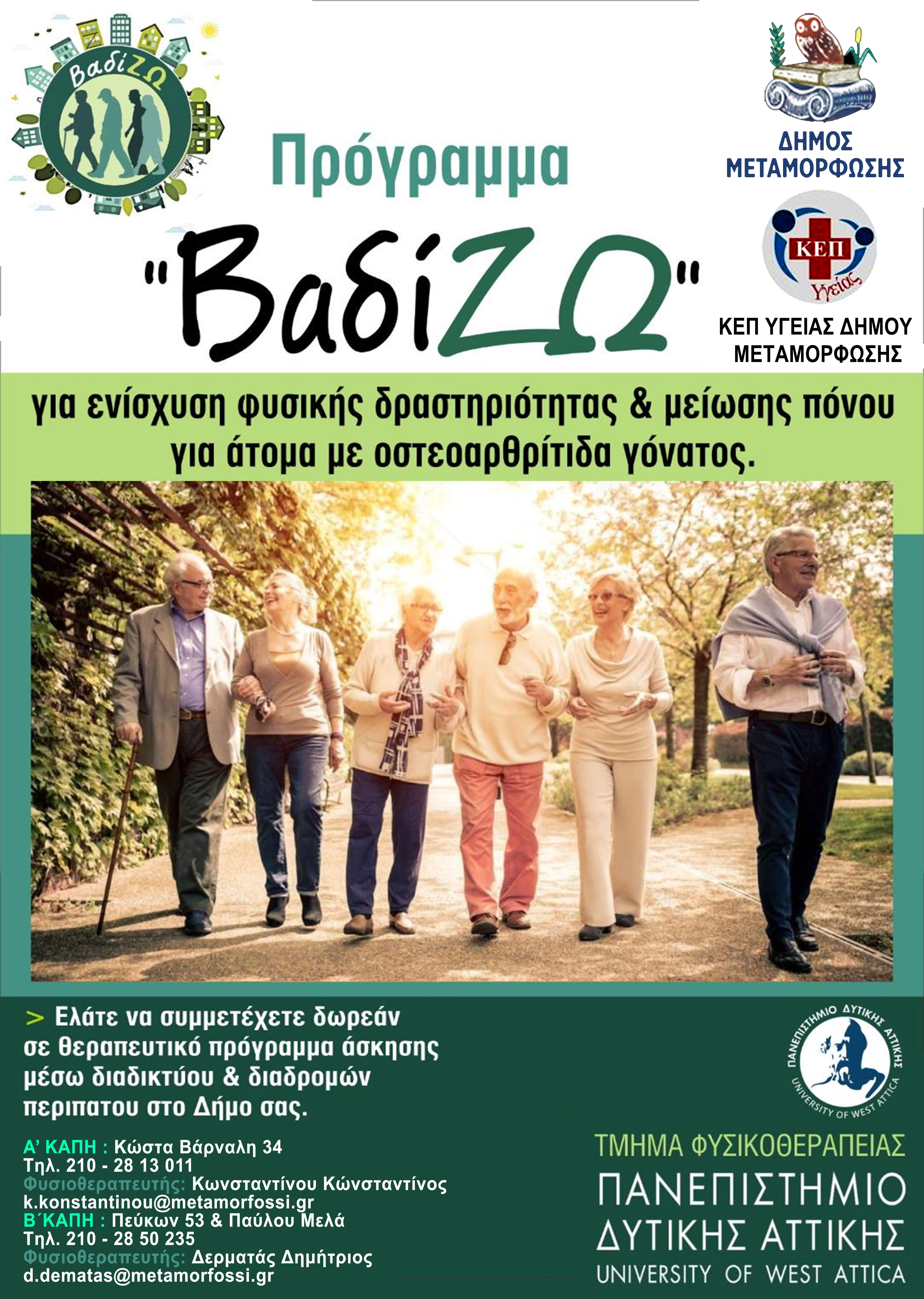 Ο Δήμος Μεταμόρφωσης σε συνεργασία με το Πανεπιστήμιο Δυτικής Αττικής Τμήμα Φυσικοθεραπείας, ξεκινούν την κοινή δράση με την ονομασία «ΒΑΔΙΖΩ».