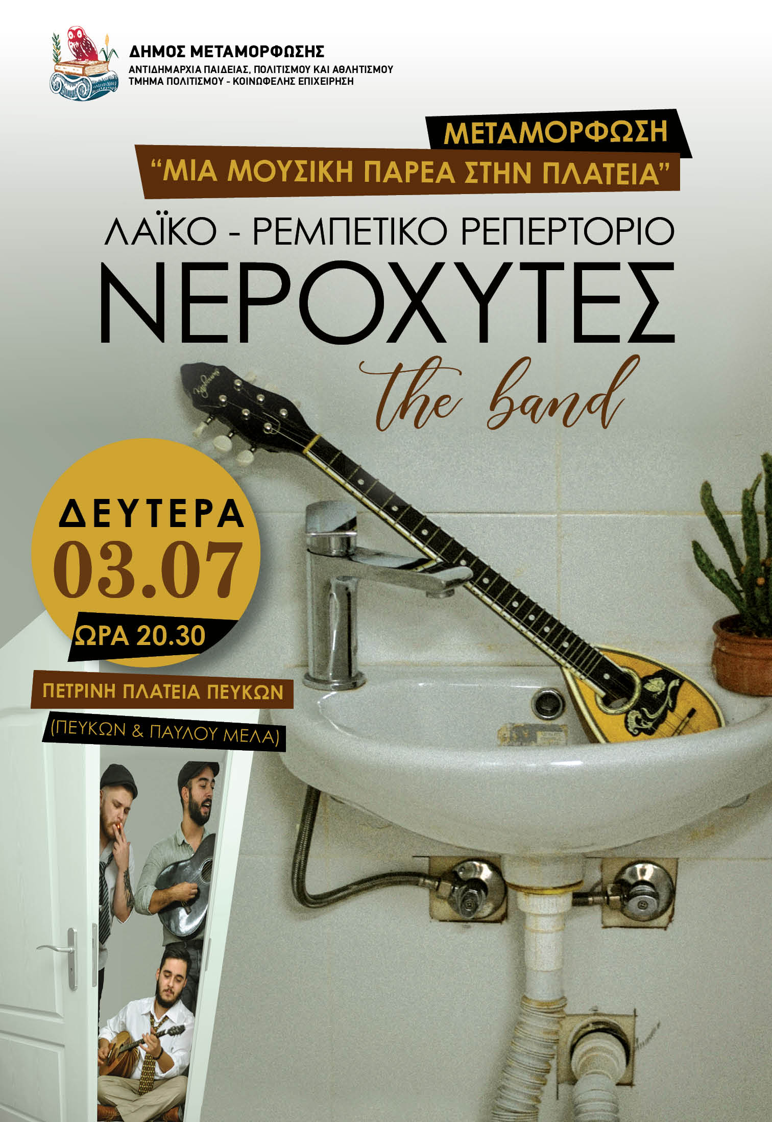 Σας περιμένουμε στην Πέτρινη Πλατεία επί της οδού Πεύκων αυτή τη φορά, όπου θα απολαύσουμε ένα εξαιρετικό ρεμπέτικο σχήμα, τους "Νεροχύτες the band" που ξεχωρίζουν για τις ποιοτικές ερμηνείες αγαπημένων τραγουδιών και το ιδιαίτερο χιούμορ τους, έχοντας διακριθεί σε επιλεγμένους μουσικούς χώρους της Αθήνας, του Πειραιά αλλά και ευρύτερα στο ρεμπέτικο και λαϊκό ρεπερτόριο.