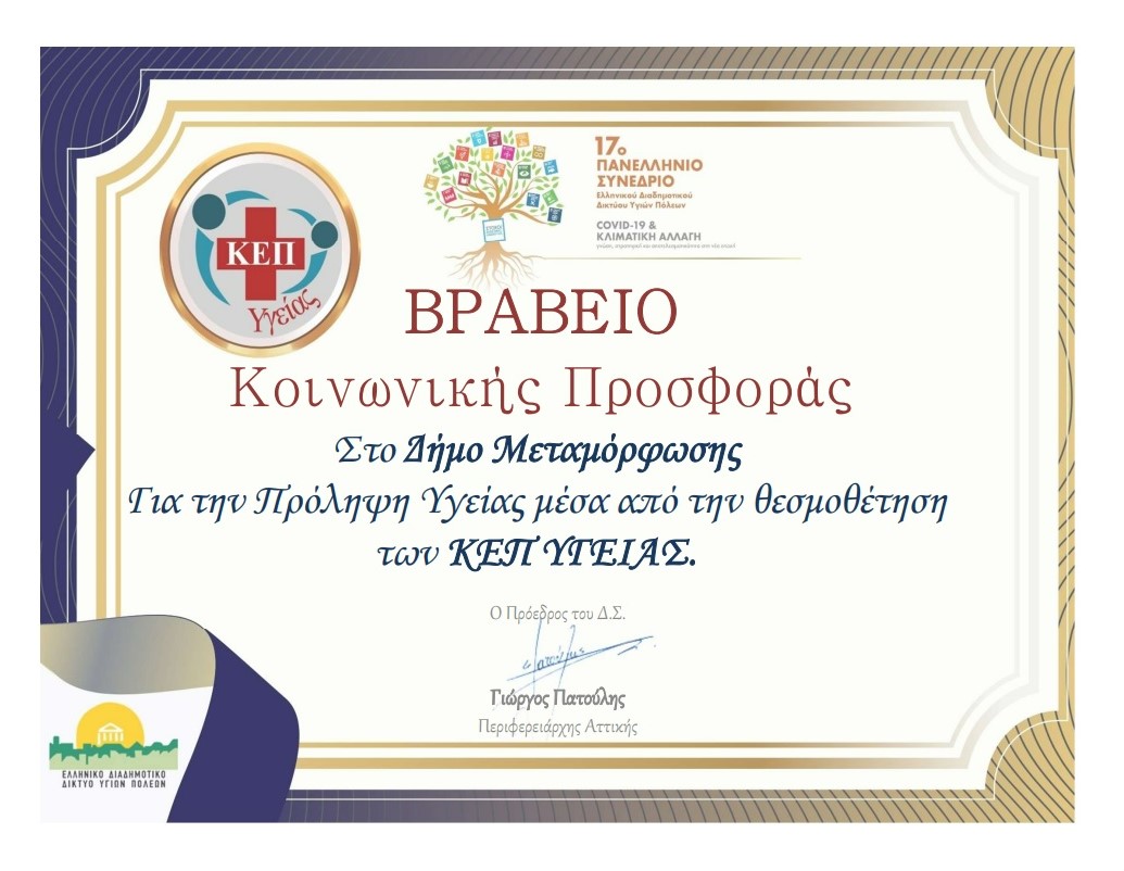 Με την συμμετοχή 80 ομιλητών από 42 Δήμους ολοκληρώθηκε το Σάββατο 13 Νοεμβρίου, με εισηγήσεις επιστημονικών φορέων και παρουσίαση καλών πρακτικών και με ομιλίες, το 17ο Πανελλήνιο Συνέδριο του Ελληνικού Διαδημοτικού Δικτύου Υγιών Πόλεων. Το «παρών» στις διεργασίες έδωσε και ο Δήμος Μεταμόρφωσης, ο οποίος μάλιστα βραβεύτηκε για το έργο του ΚΕΠ Υγείας του.