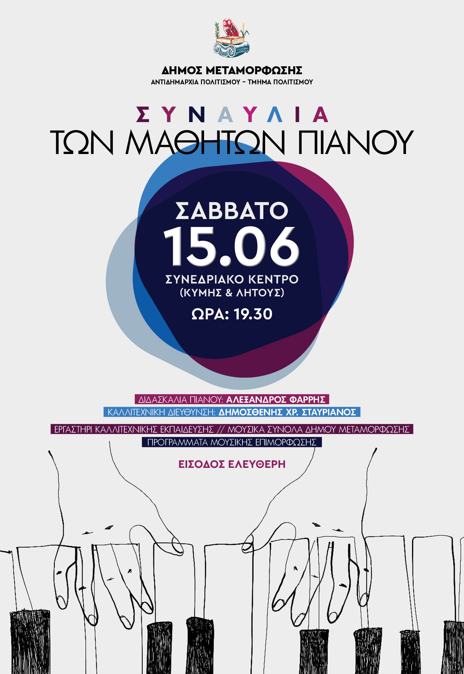 Το Τμήμα Πολιτισμού του Δήμου Μεταμόρφωσης σας προσκαλεί όλες και όλους το ερχόμενο Σάββατο 15/6 και ώρα 19:30 στο Συνεδριακό Κέντρο (Κύμης & Λητούς) για να απολαύσουμε τους μικρούς μας πιανίστες!!!