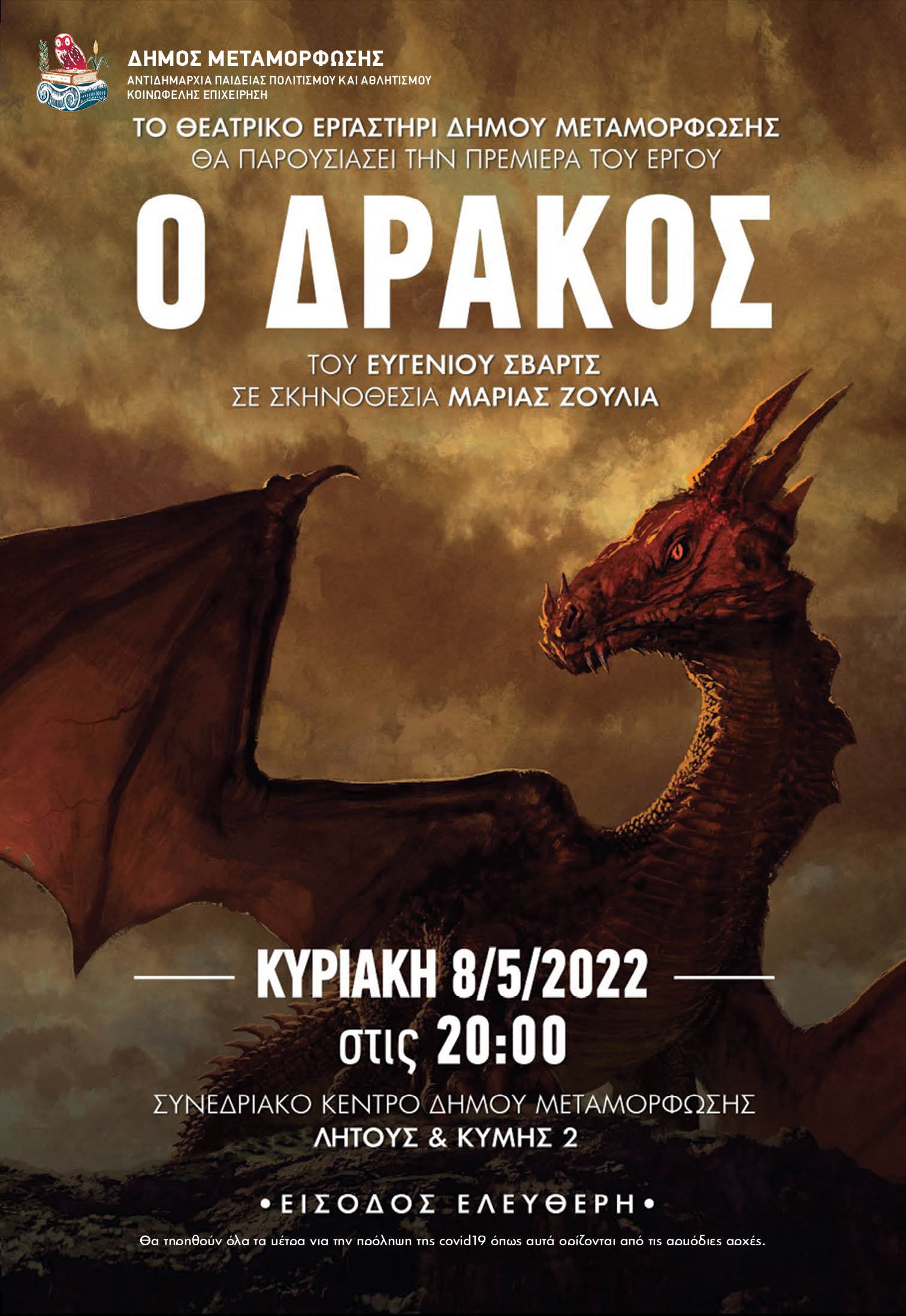 Την Κυριακή 8 Μαΐου, στις 8 το βράδυ, στο Συνεδριακό Κέντρο του Δήμου Μεταμόρφωσης θα απολαύσουμε την παράσταση του Θεατρικού Εργαστηρίου «Ο Δράκος» του Ευγένιου Σβαρτς.
