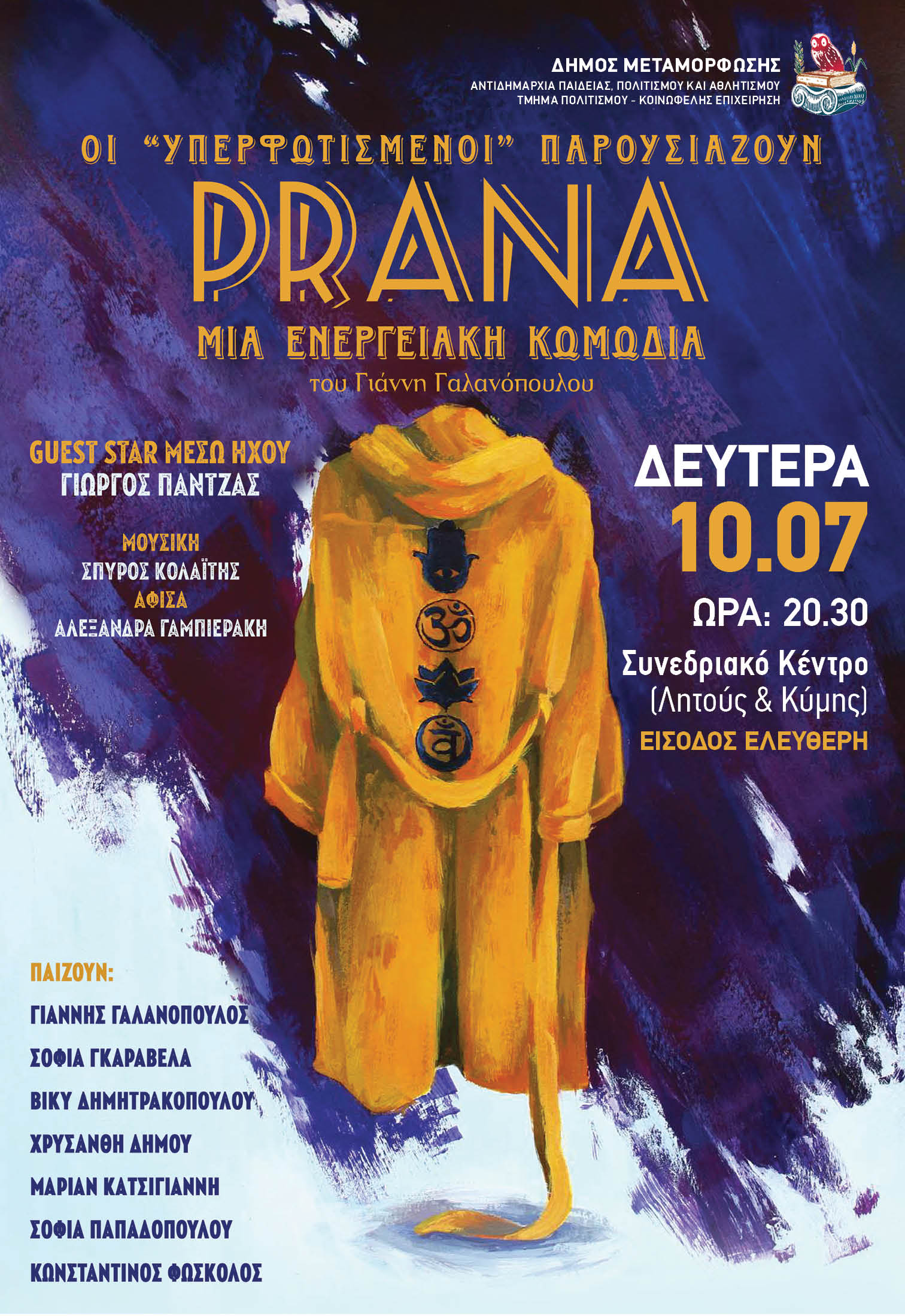 Η Θεατρική Ομάδα «Υπερφωτισμένοι - Θεατρική Ομάδα Δήμου Φυλής» μετά την περσινή παράσταση "La Nona" που καταχειροκροτήθηκε και στη Μεταμόρφωση, έρχεται την Δευτέρα 10 Ιουλίου 2023 στις 20:30, στο Συνεδριακό Κέντρο (Λητούς & Κύμης) με τη νέα, σπαρταριστή κωμωδία της, «PRANA- Μια ενεργειακή κωμωδία», που έγραψε και σκηνοθετεί ο Γιάννης Γαλανόπουλος, ο οποίος πέρυσι κατέκτησε το Βραβείο Σκηνοθεσίας στο Πανελλήνιο Φεστιβάλ Θερμαϊκού Θεσσαλονίκης.