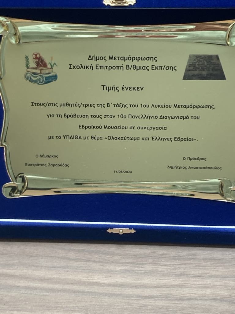 Τους μαθητές και τις μαθήτριες του 1ου Γενικού Λυκείου Μεταμόρφωσης που συμμετείχαν και διακρίθηκαν στον 10ο πανελλήνιο μαθητικό διαγωνισμό, που διοργανώνει κάθε χρόνο το Εβραϊκό Μουσείο σε συνεργασία με τη γενική Γραμματεία Θρησκευμάτων του ΥΠΑΙΘΑ, με θέμα «Ολοκαύτωμα και Έλληνες Εβραίοι» βράβευσαν ο Δήμαρχος Μεταμόρφωσης, Στράτος Σαραούδας και ο Πρόεδρος της Δευτεροβάθμιας Σχολικής Επιτροπής, Δημήτρης Αναστασόπουλος.