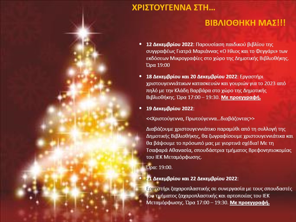 - 19 Δεκεμβρίου 2022: «Χριστούγεννα, Πρωτούγεννα…διαβάζοντας». Διαβάζουμε χριστουγεννιάτικο παραμύθι από τη συλλογή της Δημοτικής Βιβλιοθήκης, θα ζωγραφίσουμε χριστουγεννιάτικα και θα βάψουμε το πρόσωπό μας με γιορτινά σχέδια! Με τη Τσαφαρά Αθανασία, σπουδάστρια τμήματος Βρεφονηπιοκομίας του ΙΕΚ Μεταμόρφωσης. Ώρα: 19:00.