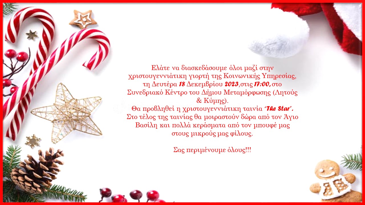 Με ιδιαίτερη χαρά και γιορτινή διάθεση σας προσκαλούμε στη Χριστουγεννιάτικη γιορτή της Κοινωνικής Υπηρεσίας που θα λάβει χώρα την Δευτέρα 18 Δεκεμβρίου και ώρα 17:30 στην Αίθουσα Εκδηλώσεων του Συνεδριακού Κέντρου (Λητούς και Κύμης, Μεταμόρφωση).